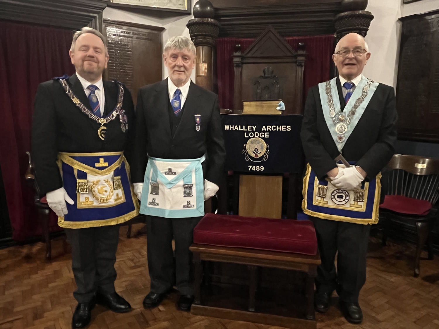 David Blenkinship with Whalley Arches Lodge WM Joseph Cunningham and APGN Dave McGurty